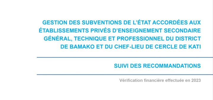 Vérification de suivi des recommandations : GESTION DES SUBVENTIONS DE L’ÉTAT ACCORDÉES AUX ÉTABLISSEMENTS PRIVÉS D’ENSEIGNEMENT SECONDAIRE GÉNÉRAL, TECHNIQUE ET PROFESSIONNEL DU DISTRICT DE BAMAKO ET DU CHEF-LIEU DE CERCE DE KATI