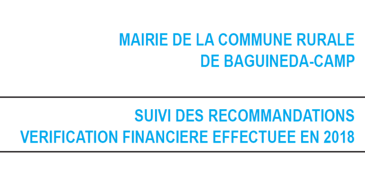 Rapports 27 novembre 2020 par arhissa · Published 27 novembre 2020 · Last modified 29 novembre 2023 Suivi des recommandations: vérification financière effectuée en 2018: Mairie de la commune rurale de Baguineda-camp