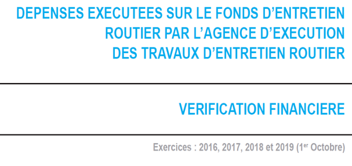 Rapports 3 septembre 2020 par arhissa · Published 3 septembre 2020 · Last modified 29 novembre 2023 Vérification financière : Dépenses exécutées sur le fonds d’entretien routier par l’Agence d’Exécution des Travaux d’Entretien Routier